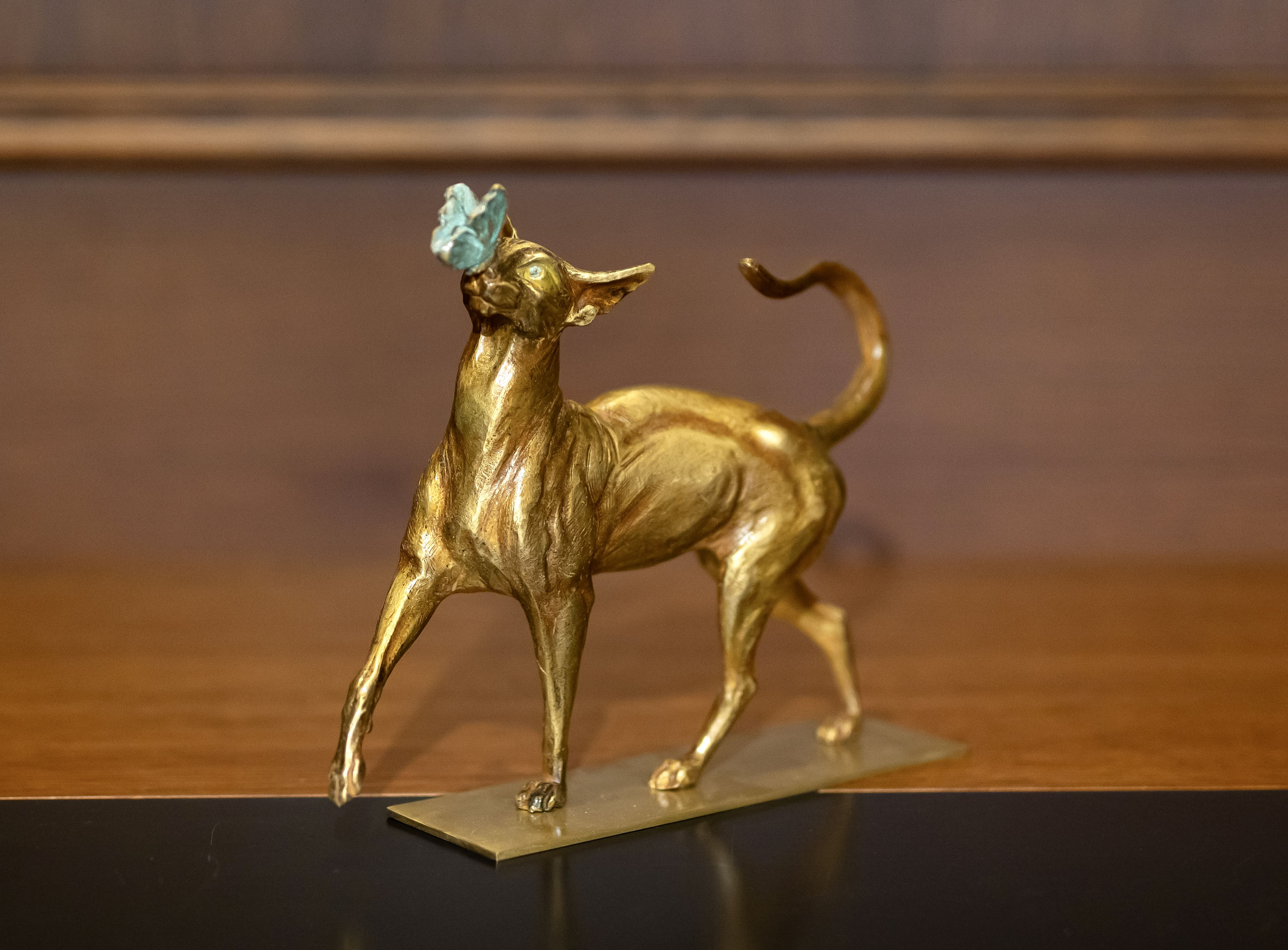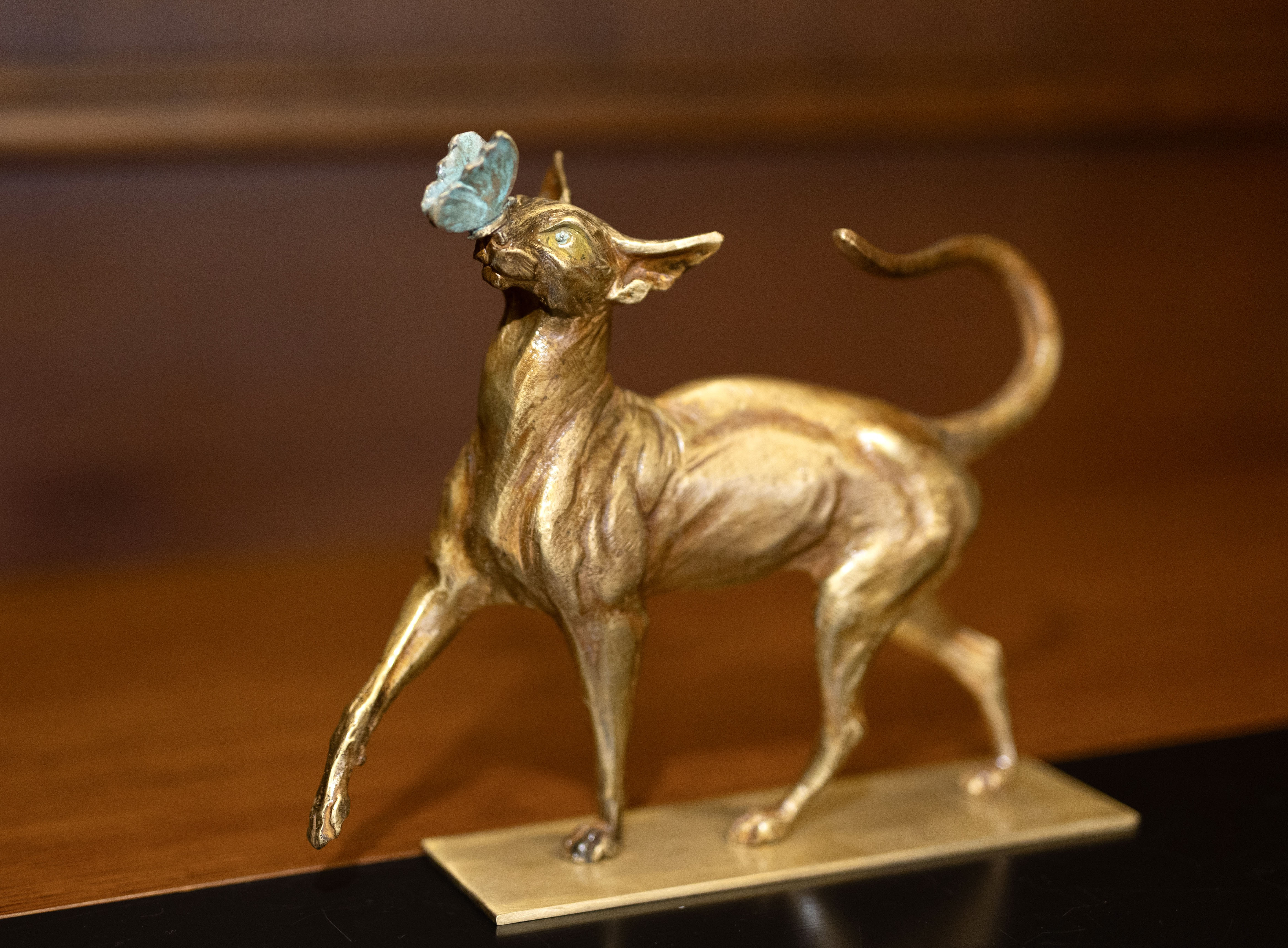 Изящная фигура кошки, играющей с бабочкой, порадует как любителей этих прекрасных животных, так и каждого, кто стремится украсить пространство произведениями искусства современных авторов.